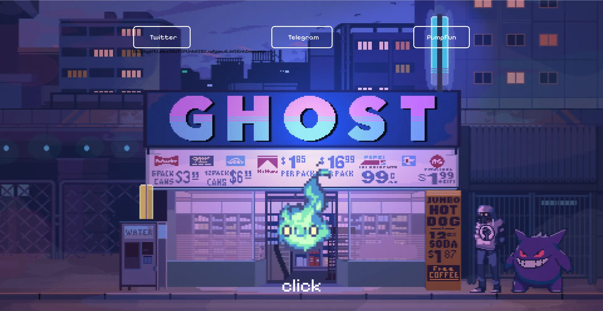 This Solana token features a pixelated ghost named GHOST standing near a cozy shop.