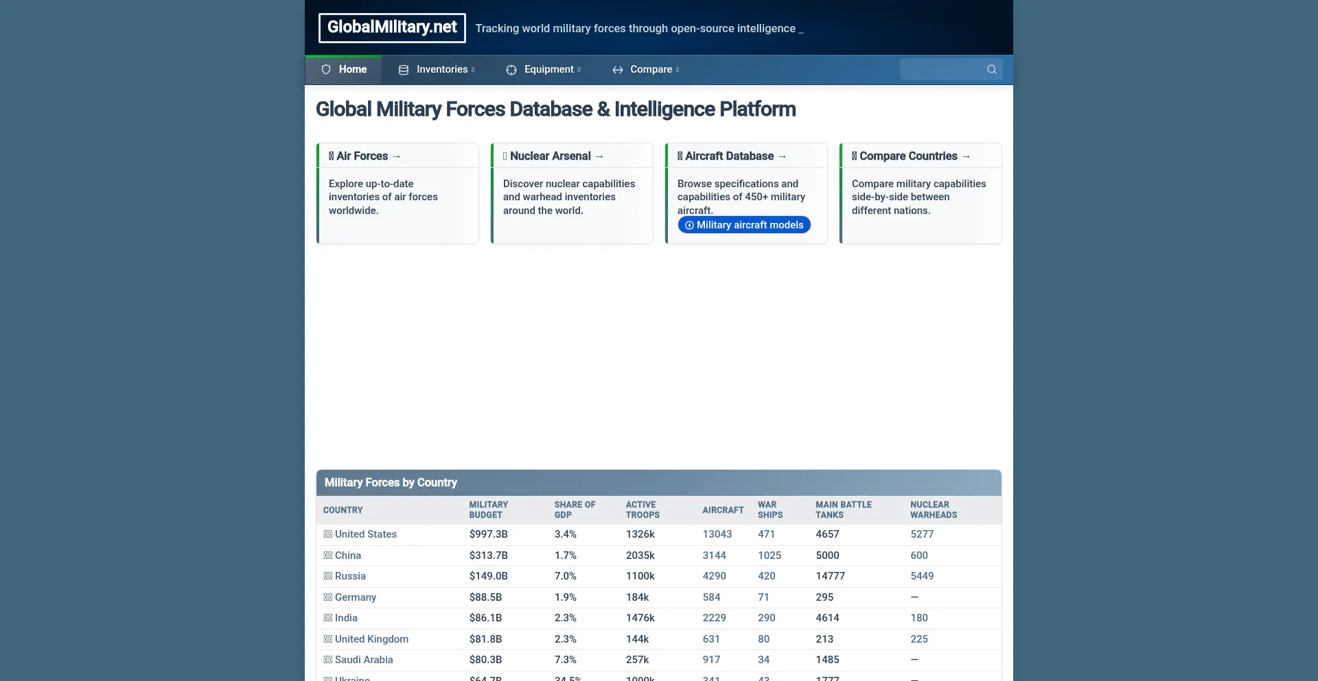 GlobalMilitary.net provides a comprehensive view of global military forces based on OSINT. We collect, curate and visualize complex data on airpower, naval capabilities, manpowe...