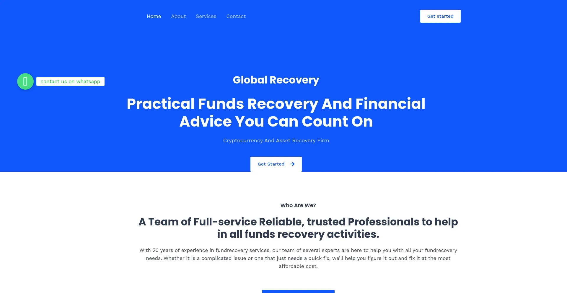 O site globalrecov.com anuncia serviços de recuperação de fundos para ativos perdidos ou roubados. Enquanto alguns operam em estruturas de honorários de contingência, outros podem exigir pagamentos antecipados, o que pode indicar operações fraudulentas. Verifique credenciais e conformidade regulatória antes de contratar tais serviços.