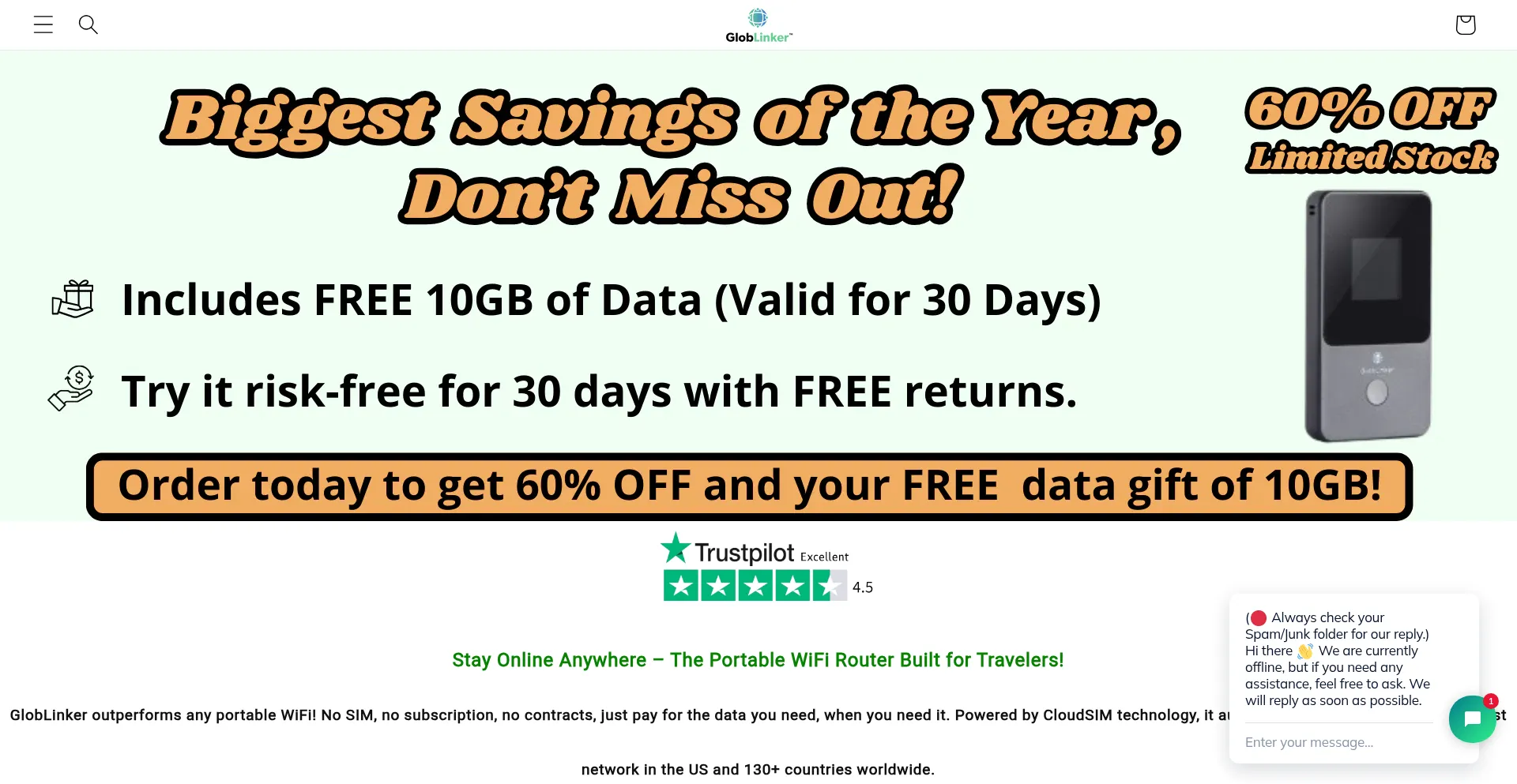 Stay connected wherever you go with Globlinker Portable WiFi Hotspot. Offering high-speed 4G LTE internet, no SIM card needed, and coverage across the US and 130+ countries. Per...