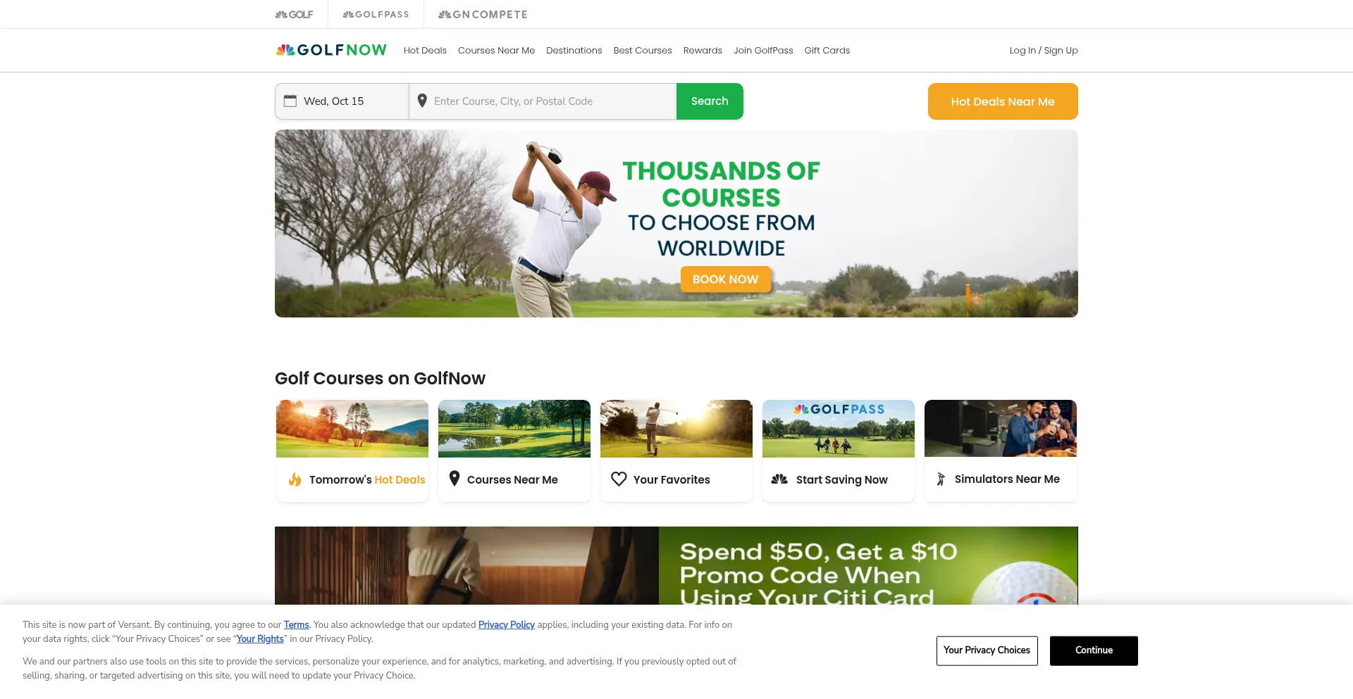 O site implementa mecanismos de consentimento de cookies em conformidade com regulamentações de privacidade como GDPR ou CCPA. Isso demonstra que golfnow.com adere a padrões de proteção de dados e fornece aos usuários controle sobre práticas de coleta de dados pessoais.