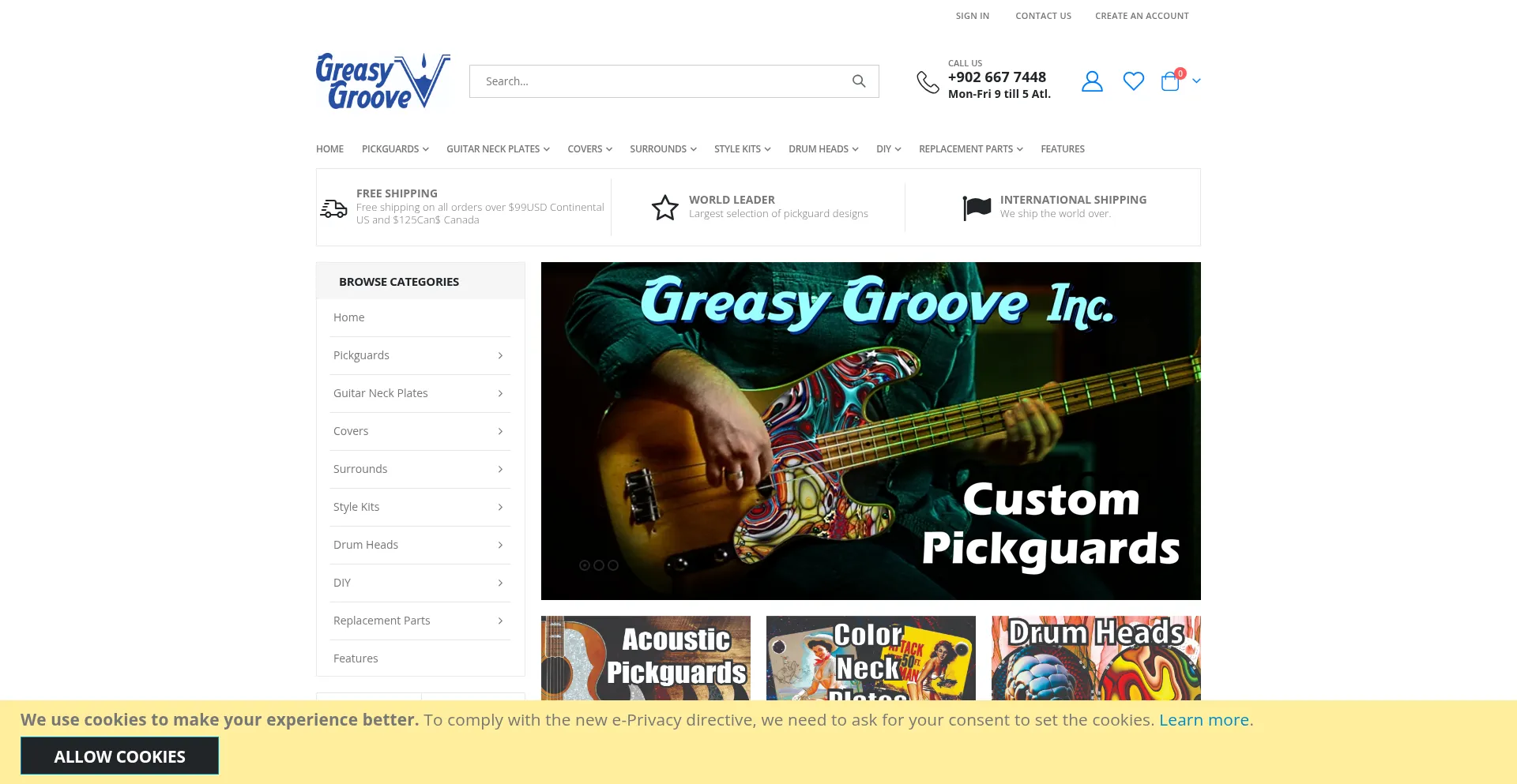 Greasy groove inc specializes in the manufacture of guitar pickguards for acoustic and electric guitars. We are a manufacturer of custom drum heads and custom guitar neckplates....
