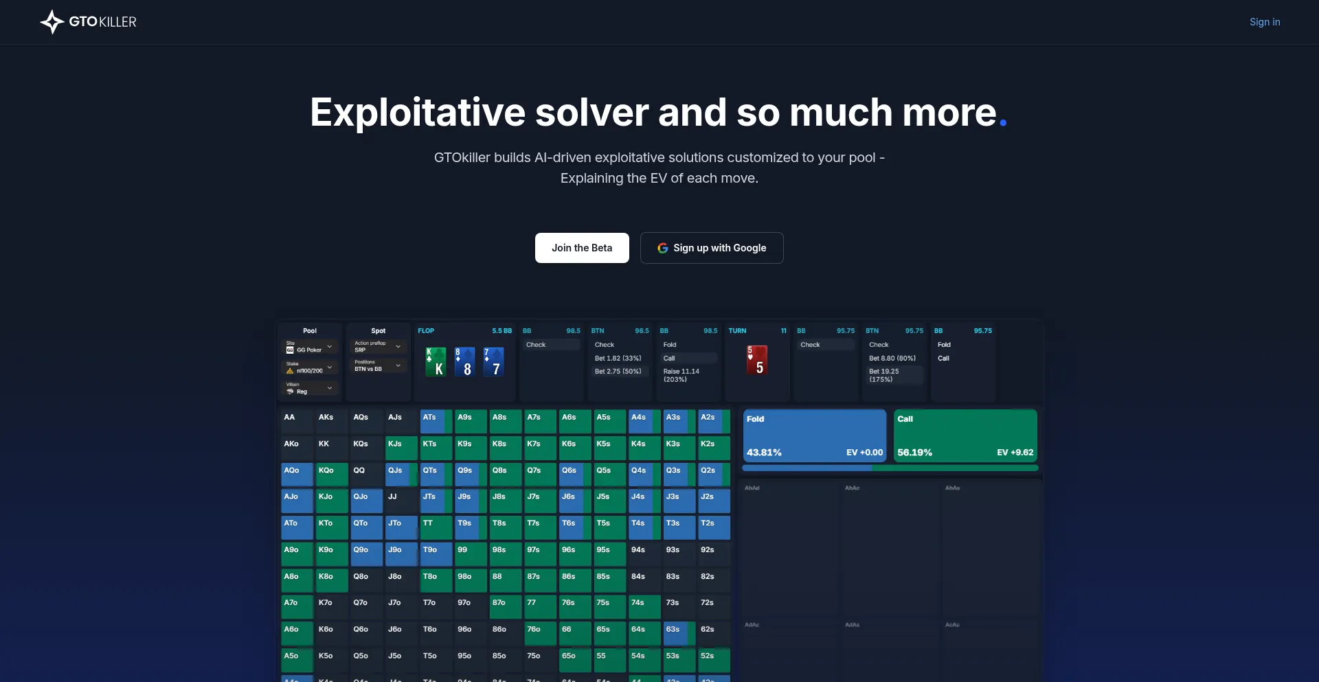 GTOkiller is the AI-powered exploitative poker solver. It adapts to meta leaks and creates strategies that maximize EV.