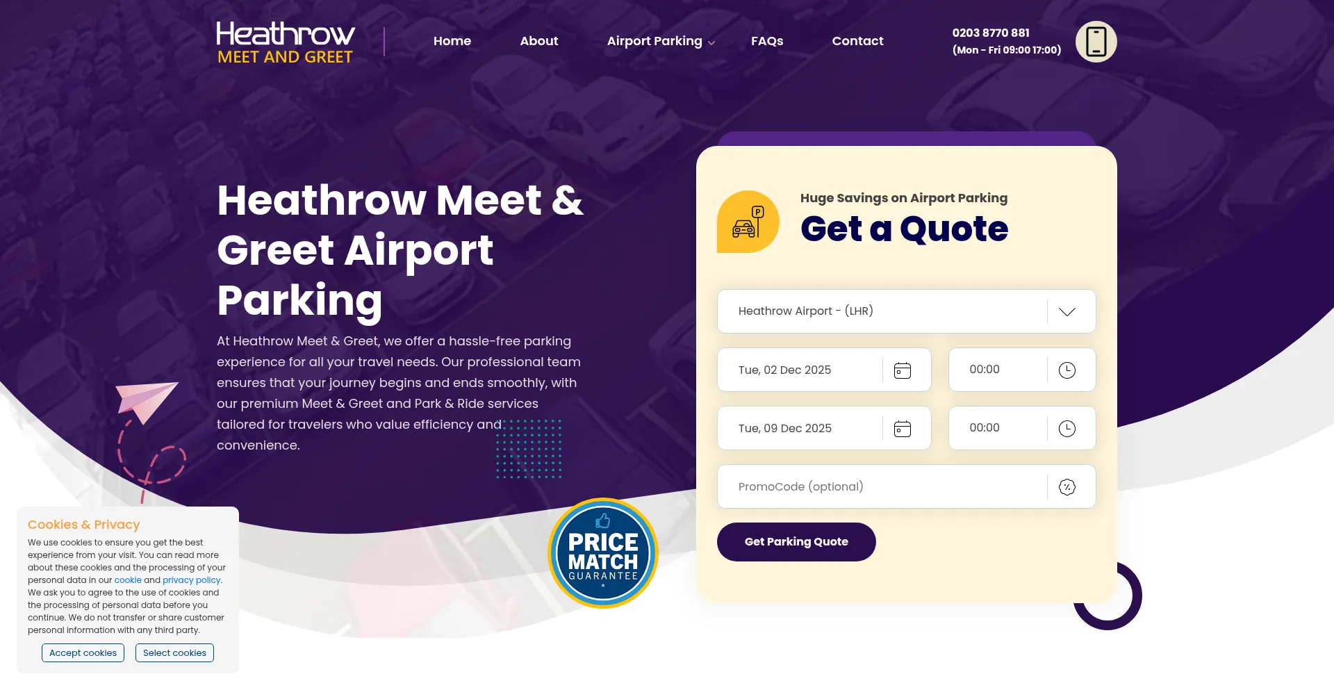 O site implementa mecanismos de consentimento de cookies em conformidade com regulamentações de privacidade como GDPR ou CCPA. Isso demonstra que heathrowmeetandgreet.co.uk adere a padrões de proteção de dados e fornece aos usuários controle sobre práticas de coleta de dados pessoais.