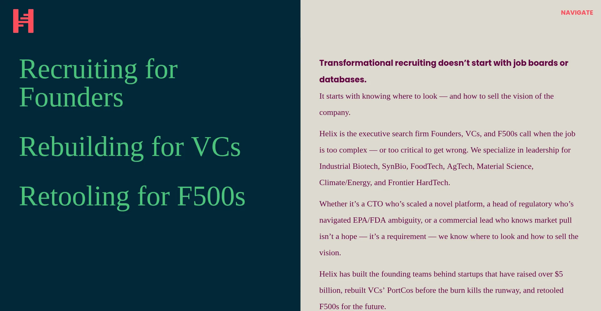 Helix recruits transformational leaders for biotech, food tech, materials, and renewables. Trusted by Founders, VCs, and Fortune 500s.