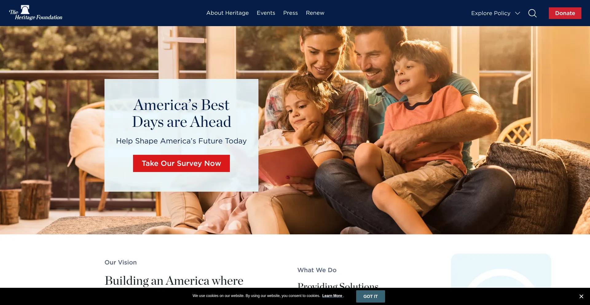 O site implementa mecanismos de consentimento de cookies em conformidade com regulamentações de privacidade como GDPR ou CCPA. Isso demonstra que heritage.org adere a padrões de proteção de dados e fornece aos usuários controle sobre práticas de coleta de dados pessoais.