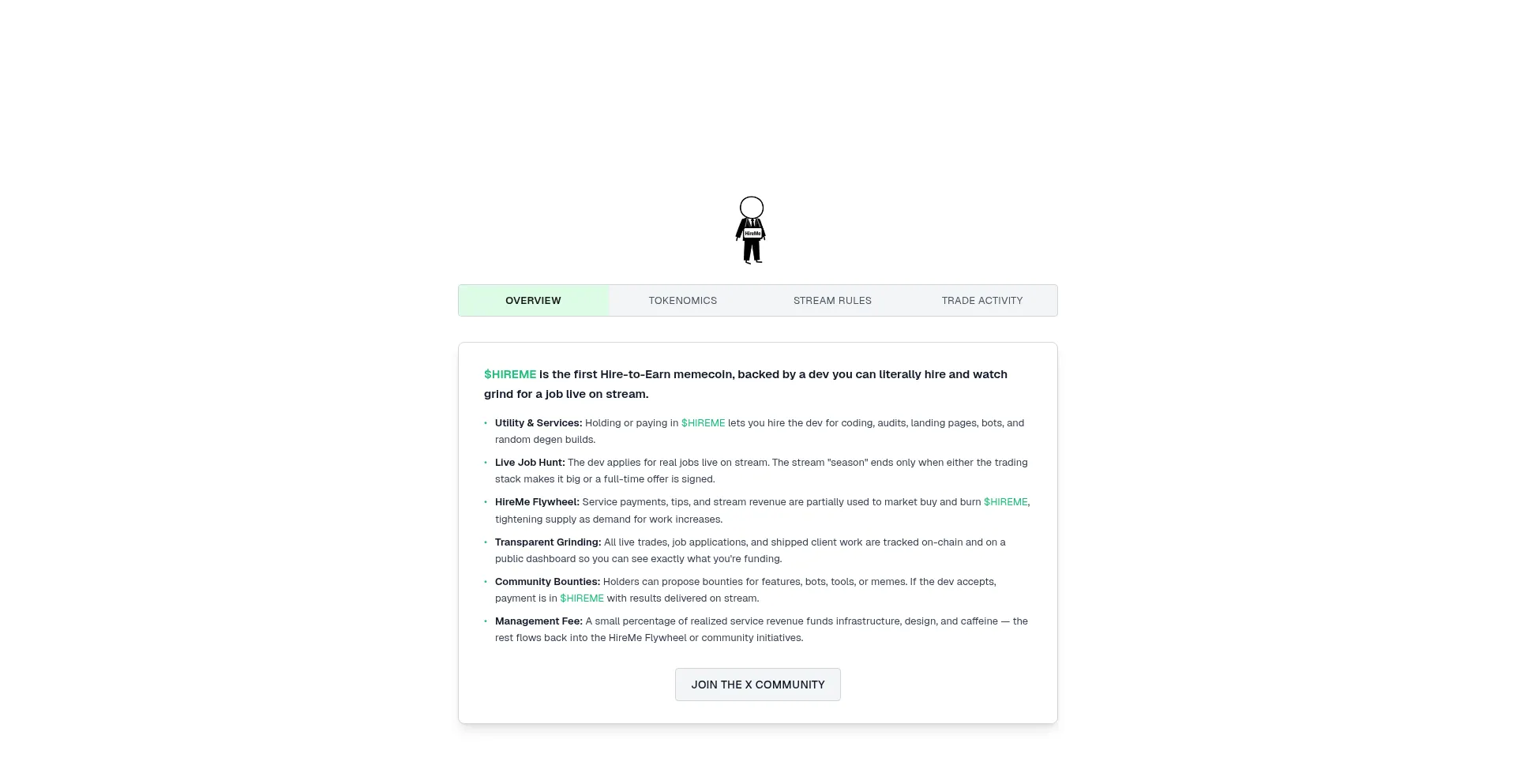 The first Hire-to-Earn memecoin, backed by a dev you can literally hire and watch grind for a job live on stream.