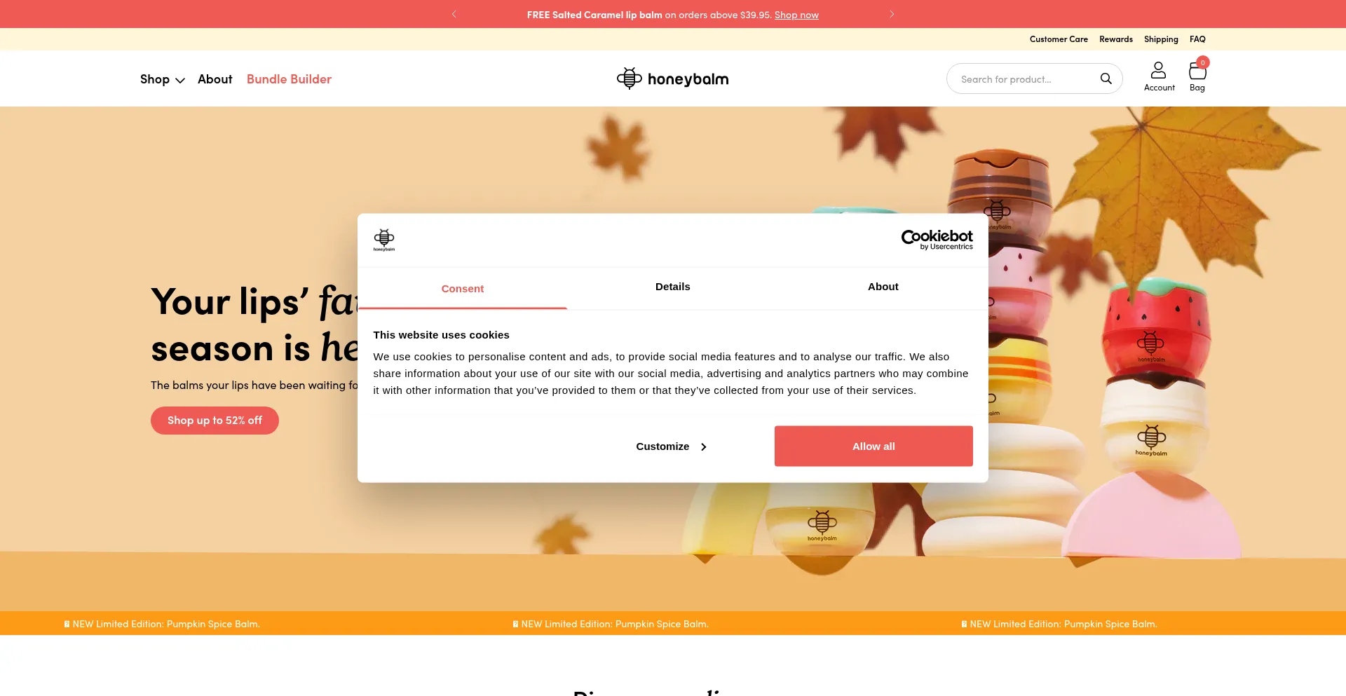 O site implementa mecanismos de consentimento de cookies em conformidade com regulamentações de privacidade como GDPR ou CCPA. Isso demonstra que honeybalm.com adere a padrões de proteção de dados e fornece aos usuários controle sobre práticas de coleta de dados pessoais.