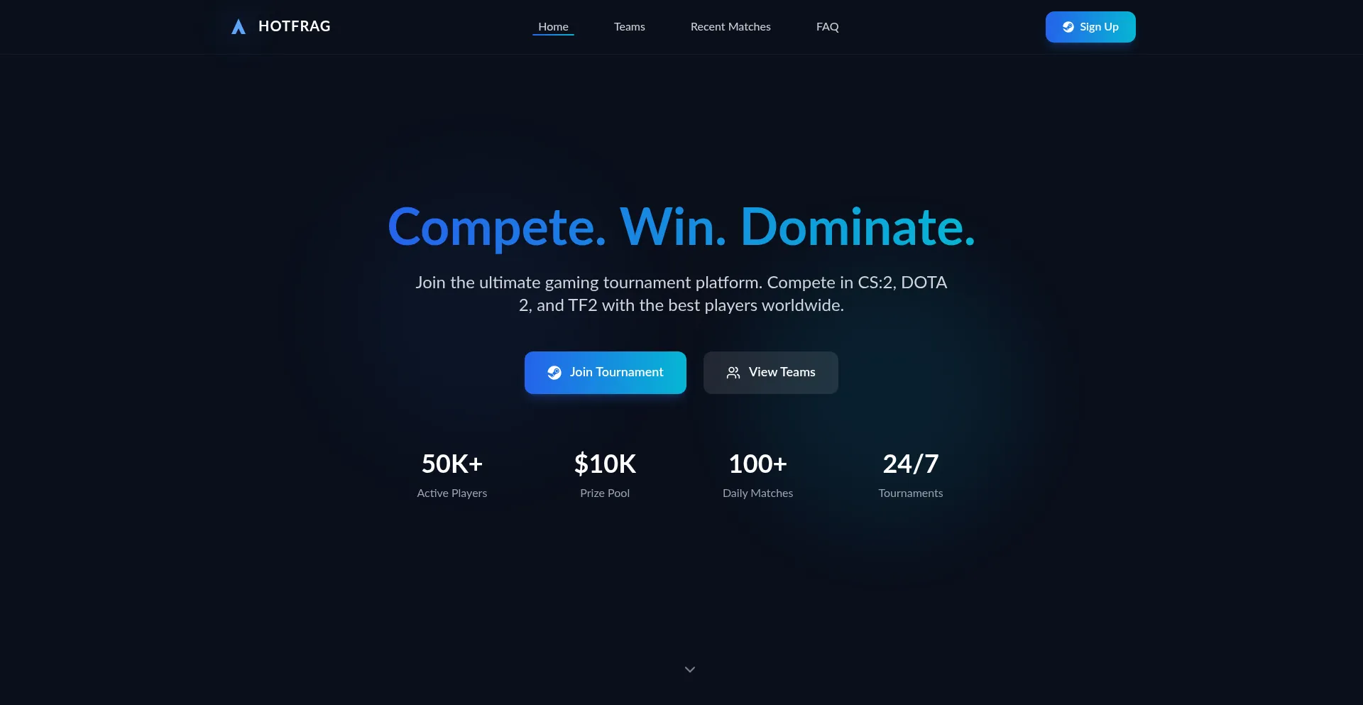 Join the ultimate gaming tournament platform! Compete in CS:2, DOTA 2, and TF2 with 50K+ active players. $45K prize pool, 100+ daily matches, 24/7 tournaments. Free registration!