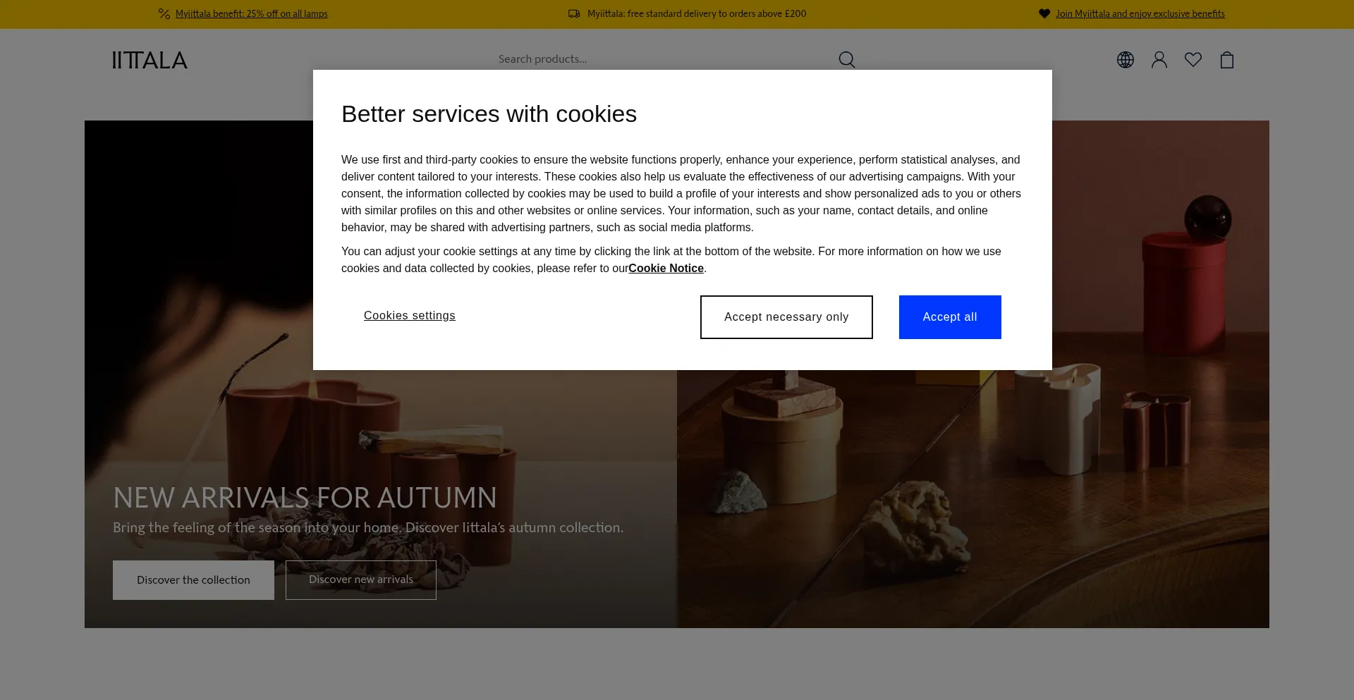 O site implementa mecanismos de consentimento de cookies em conformidade com regulamentações de privacidade como GDPR ou CCPA. Isso demonstra que iittala.com adere a padrões de proteção de dados e fornece aos usuários controle sobre práticas de coleta de dados pessoais.