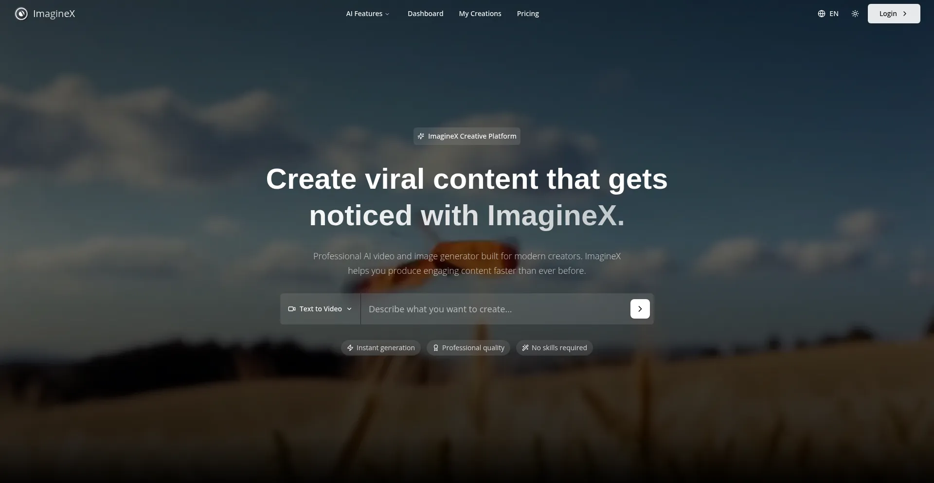Create stunning videos and images with ImagineX. Professional AI content generation platform for creators, marketers and businesses. Fast, easy, and high-quality results.