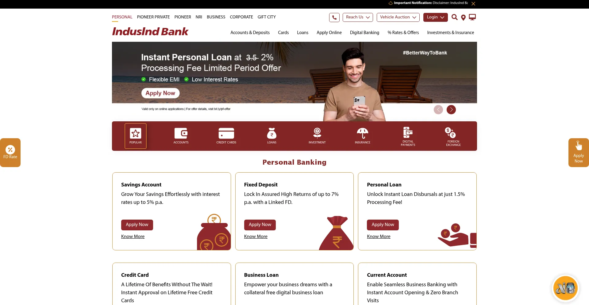 IndusInd Bank offers personal and business banking products and services, including savings & current accounts, fixed deposits, cards, loans, NRI Banking and investment products.