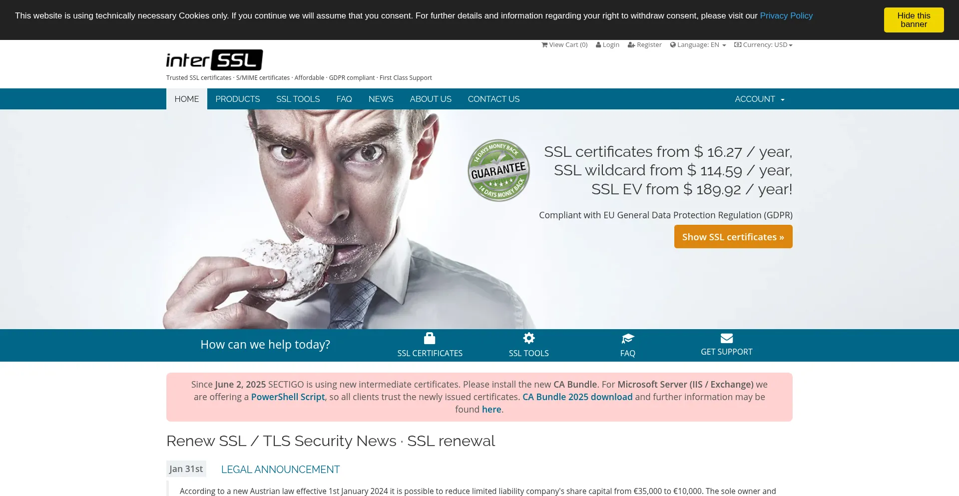 SSL certificate renewal from €10.63 / $12.65 annually · trust seal