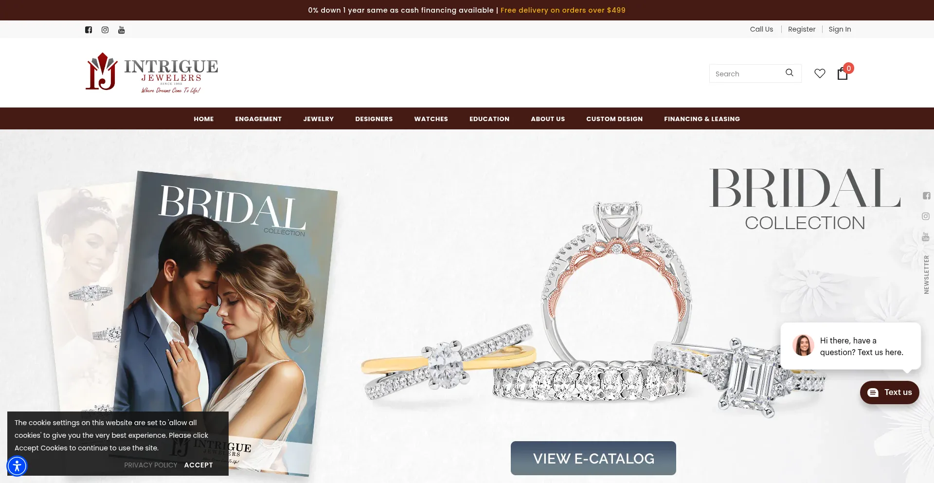 O site implementa mecanismos de consentimento de cookies em conformidade com regulamentações de privacidade como GDPR ou CCPA. Isso demonstra que intriguejeweler.com adere a padrões de proteção de dados e fornece aos usuários controle sobre práticas de coleta de dados pessoais.