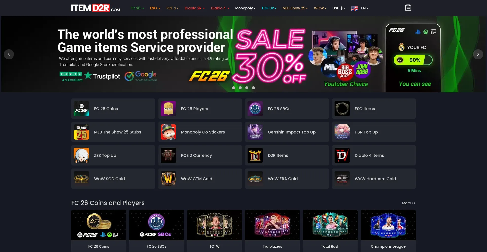 Buy cheap FC 26 Coins, ESO Items, Diablo 4 Items, POE2 Currency & D2R Items at ItemD2R. Fast delivery, safe trade, and the best game deals online.