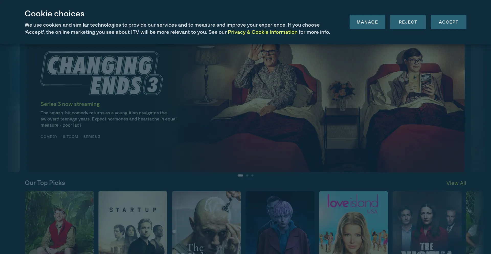 O site implementa mecanismos de consentimento de cookies em conformidade com regulamentações de privacidade como GDPR ou CCPA. Isso demonstra que itv.com adere a padrões de proteção de dados e fornece aos usuários controle sobre práticas de coleta de dados pessoais.