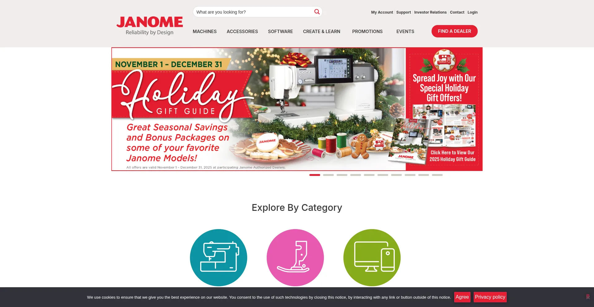 O site implementa mecanismos de consentimento de cookies em conformidade com regulamentações de privacidade como GDPR ou CCPA. Isso demonstra que janome.com adere a padrões de proteção de dados e fornece aos usuários controle sobre práticas de coleta de dados pessoais.