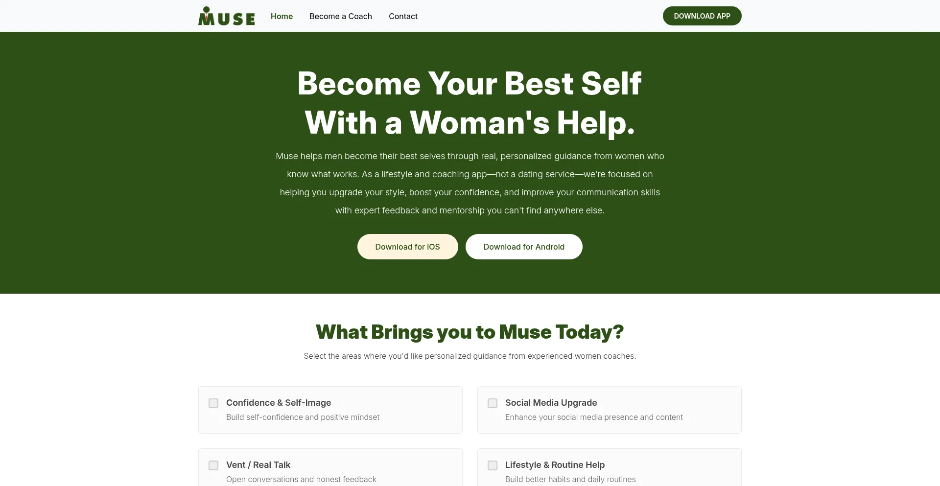 JoinMuse offers expert coaching from beautiful, genuine women who care about your growth. Get personalized advice to improve your confidence, style, communication, and more.