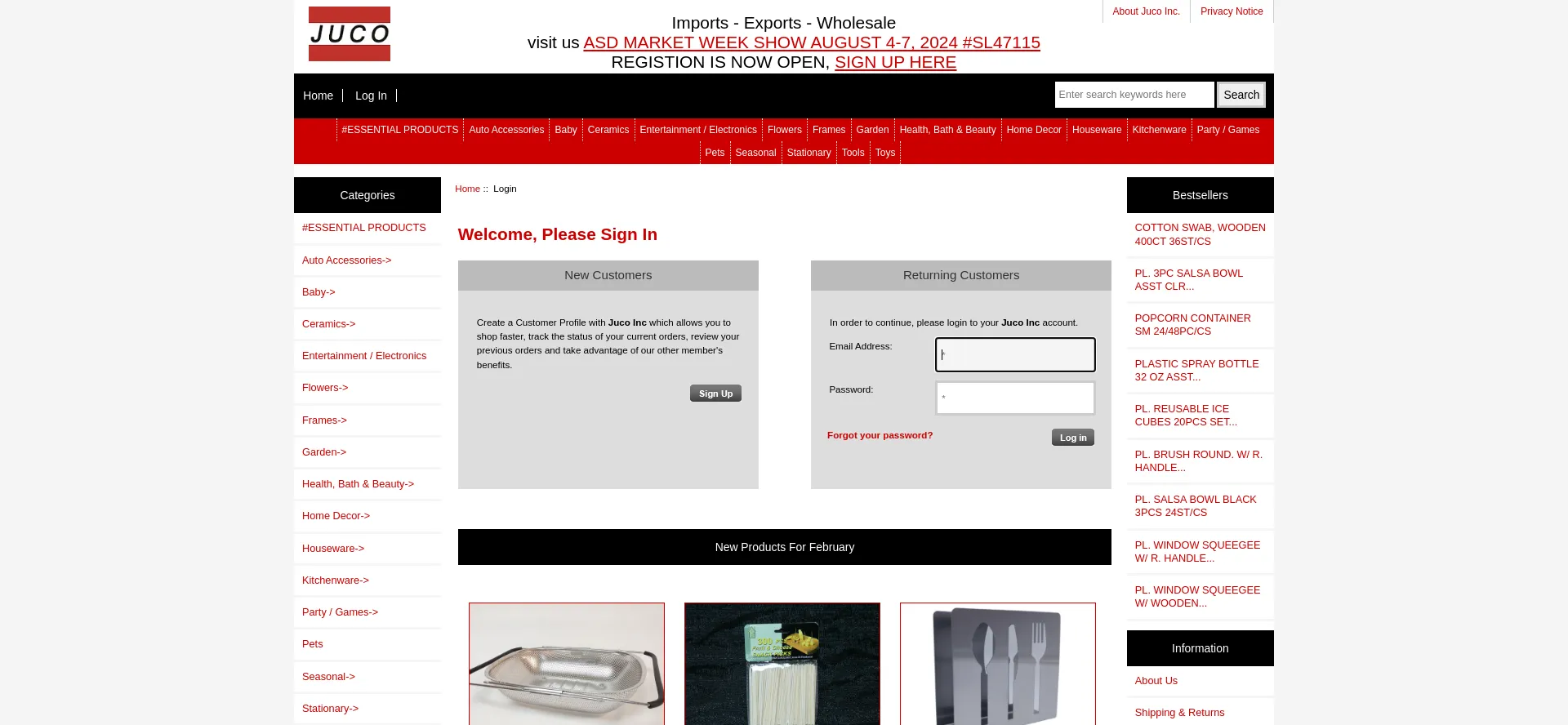 Juco Inc. : Login - Auto Accessories Baby Health, Bath & Beauty Ceramics Flowers Frames Garden Houseware Kitchenware Pets Party / Games Seasonal Stationary Tools Toys Home Decor...
