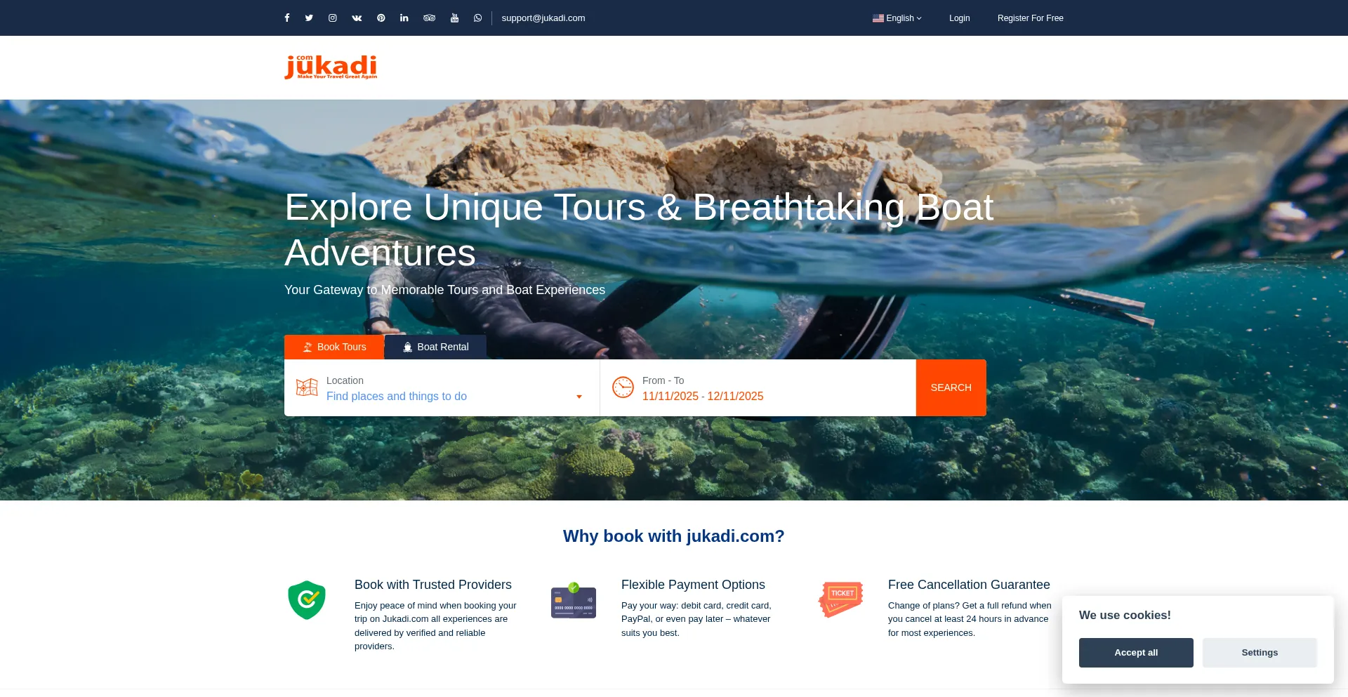 Book tours, boat trips, and adventures with Jukadi.com. Enjoy snorkeling, safaris, diving & luxury yachts. Easy booking and secure payments!