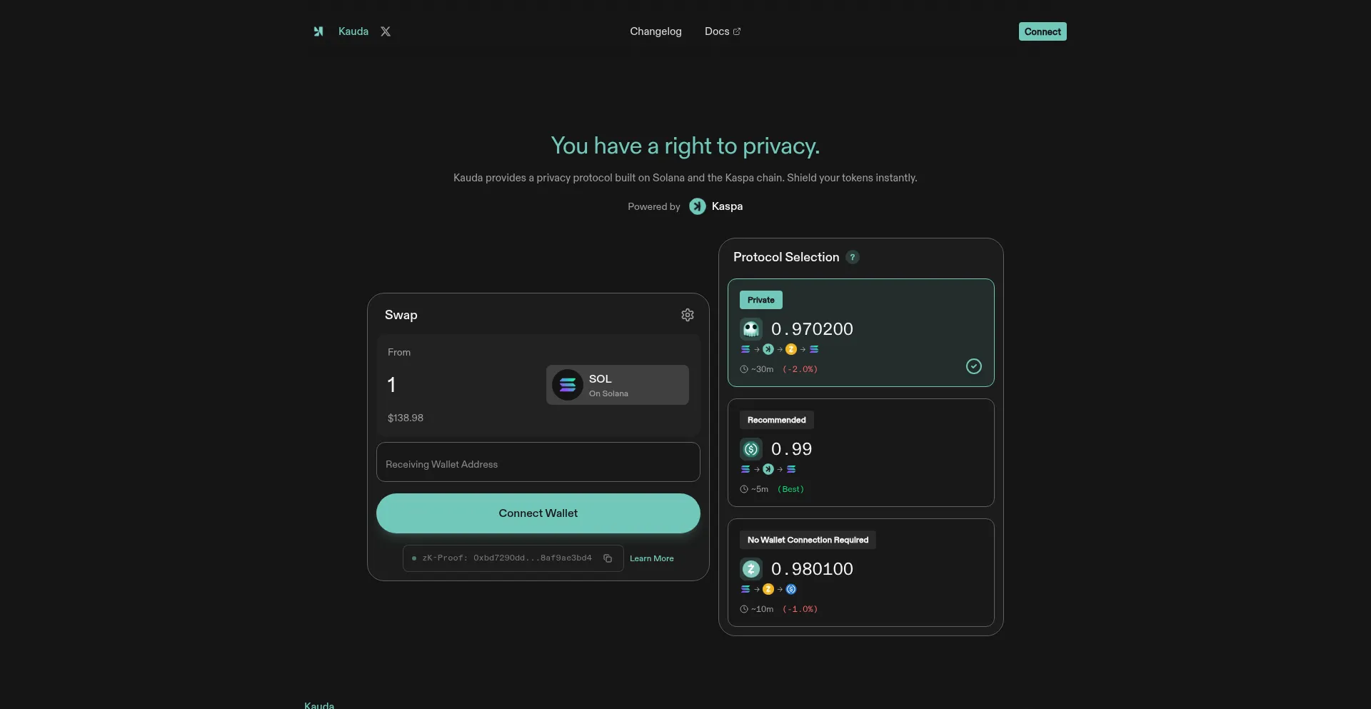 Kauda provides a privacy protocol built on Solana and the Kaspa chain. Shield your tokens instantly.