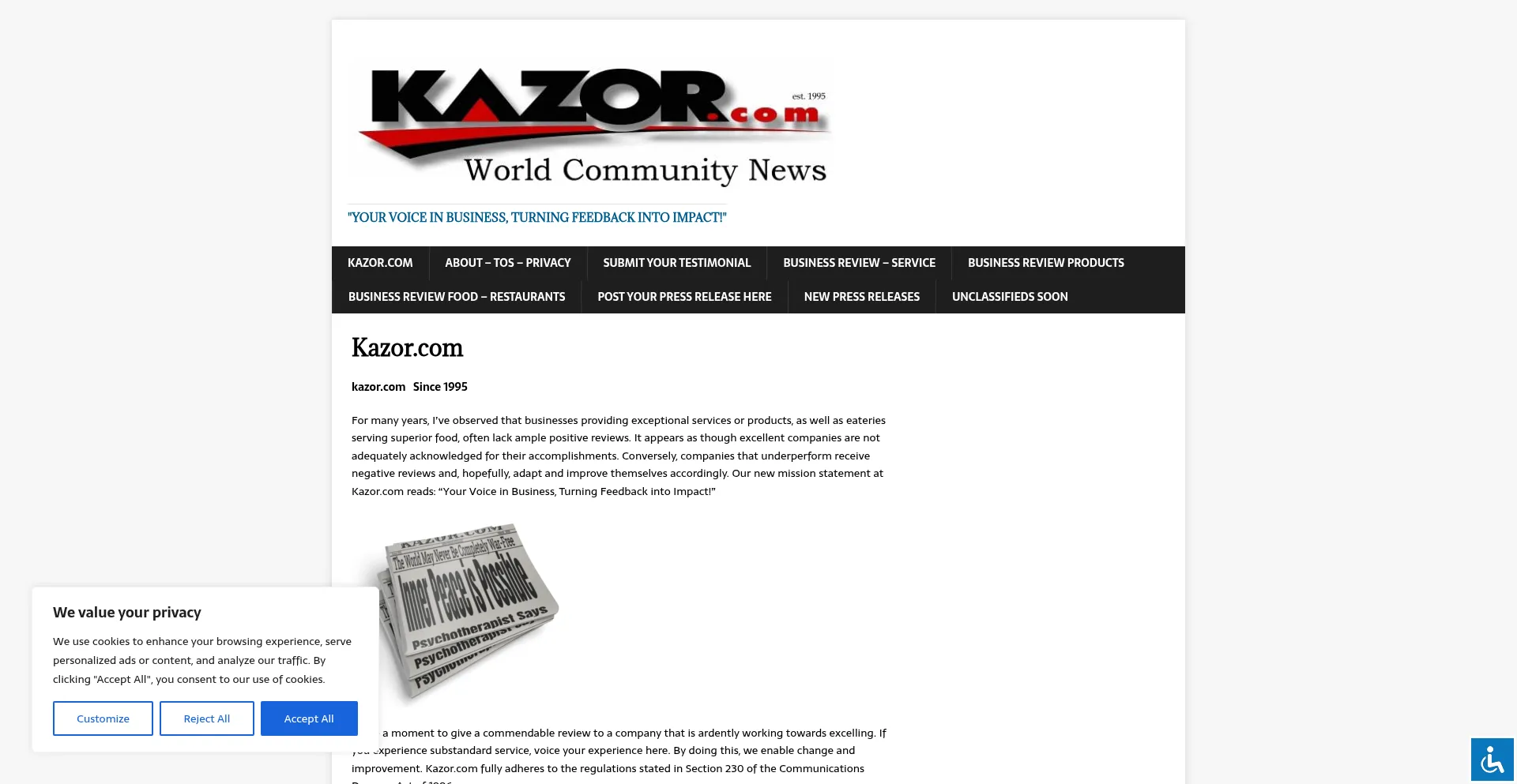 O site implementa mecanismos de consentimento de cookies em conformidade com regulamentações de privacidade como GDPR ou CCPA. Isso demonstra que kazor.com adere a padrões de proteção de dados e fornece aos usuários controle sobre práticas de coleta de dados pessoais.