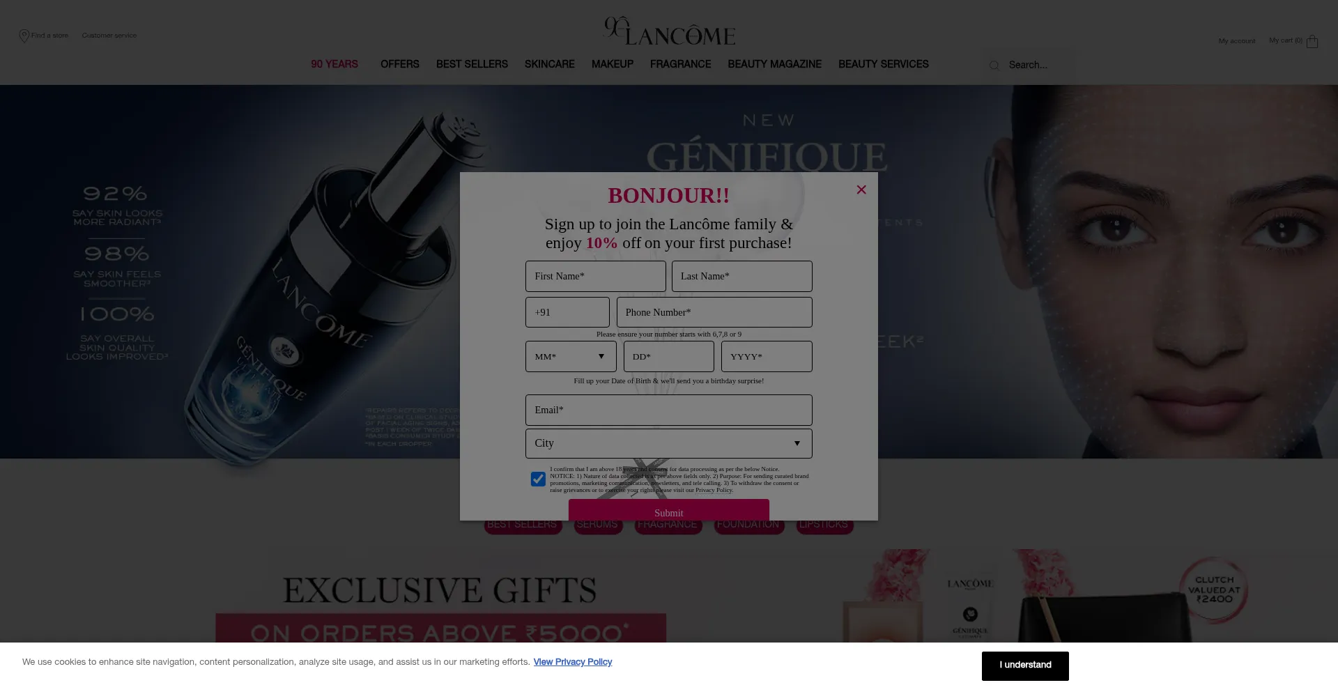 O site implementa mecanismos de consentimento de cookies em conformidade com regulamentações de privacidade como GDPR ou CCPA. Isso demonstra que lancome.in adere a padrões de proteção de dados e fornece aos usuários controle sobre práticas de coleta de dados pessoais.