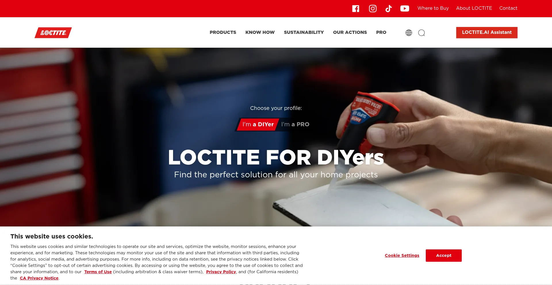 O site implementa mecanismos de consentimento de cookies em conformidade com regulamentações de privacidade como GDPR ou CCPA. Isso demonstra que loctiteproducts.com adere a padrões de proteção de dados e fornece aos usuários controle sobre práticas de coleta de dados pessoais.