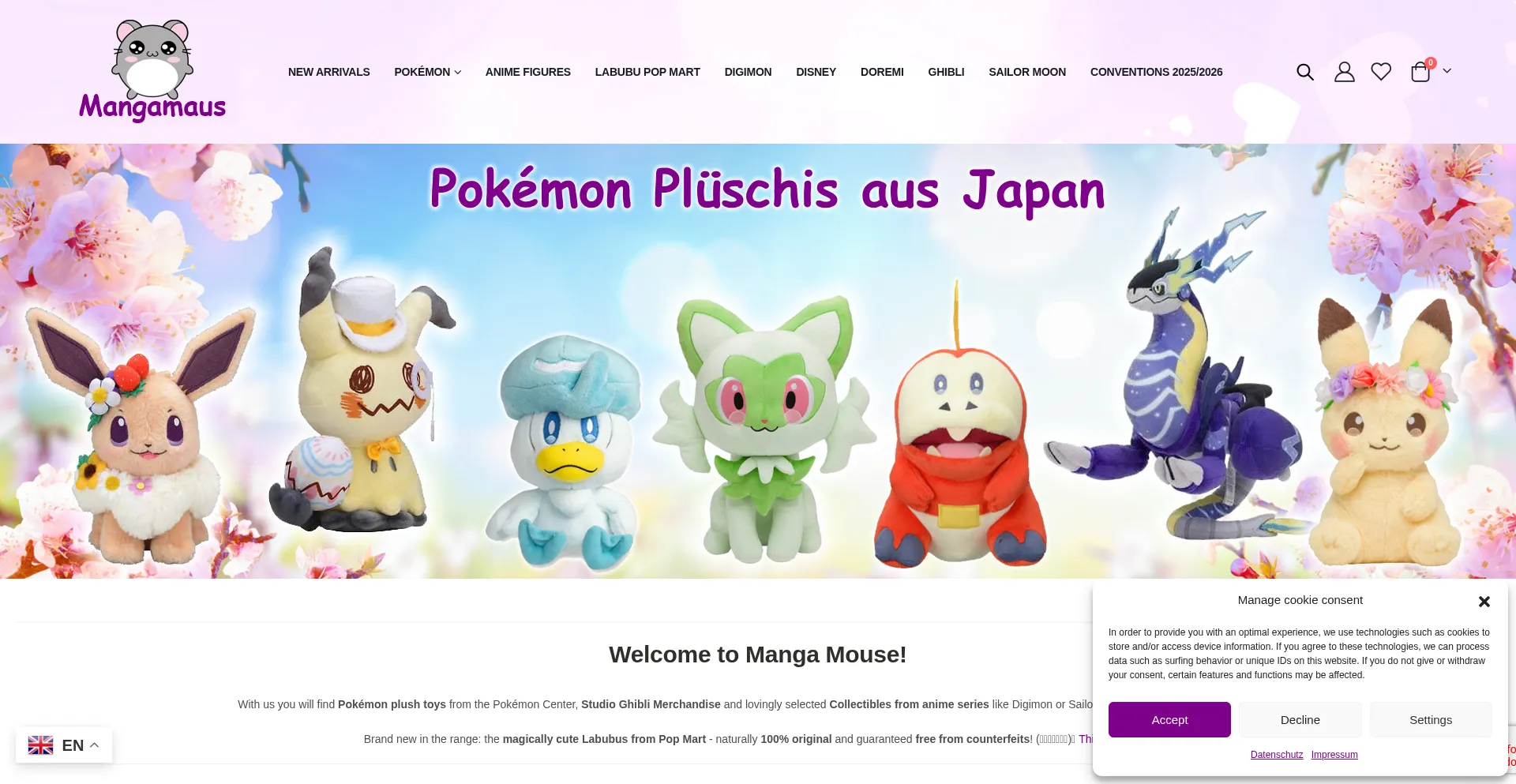 Shop plushies from the Pokémon Center Japan, Pokémon trading cards and mystery packs online or at Austrian anime/manga cons.