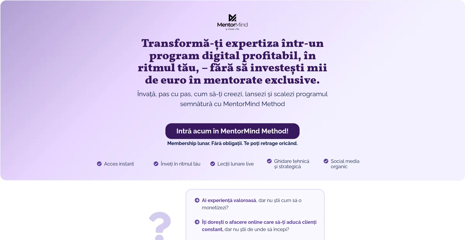 MentorMind Method este membership-ul lunar în care înveți pas cu pas cum să-ți creezi programul semnătură, să-l lansezi și să-l scalezi.