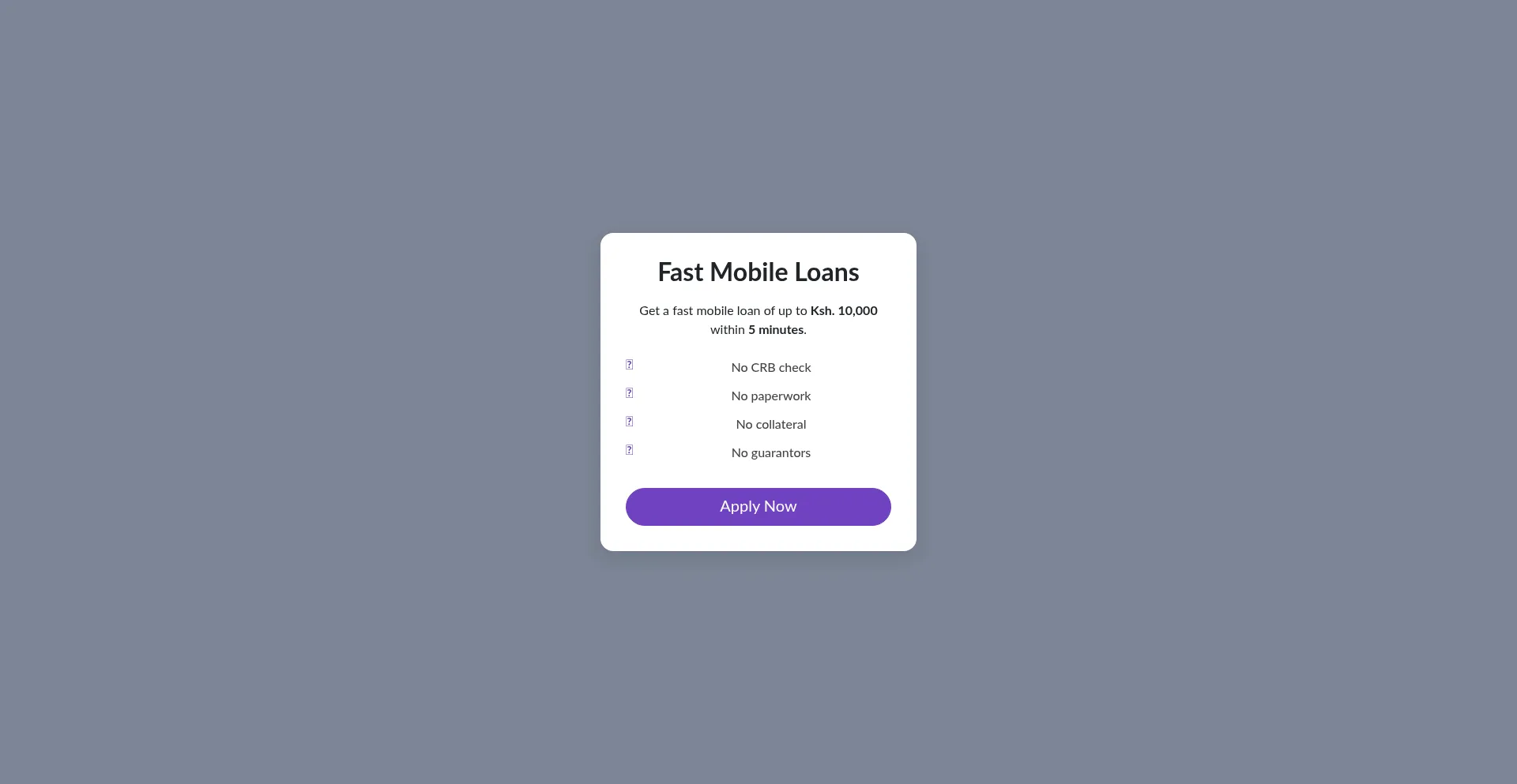 Get quick mobile loans up to Ksh. 10,000 in minutes. No CRB checks, no paperwork, no collateral, and no guarantors. Instant approval and disbursement via Mpesa in Kenya.