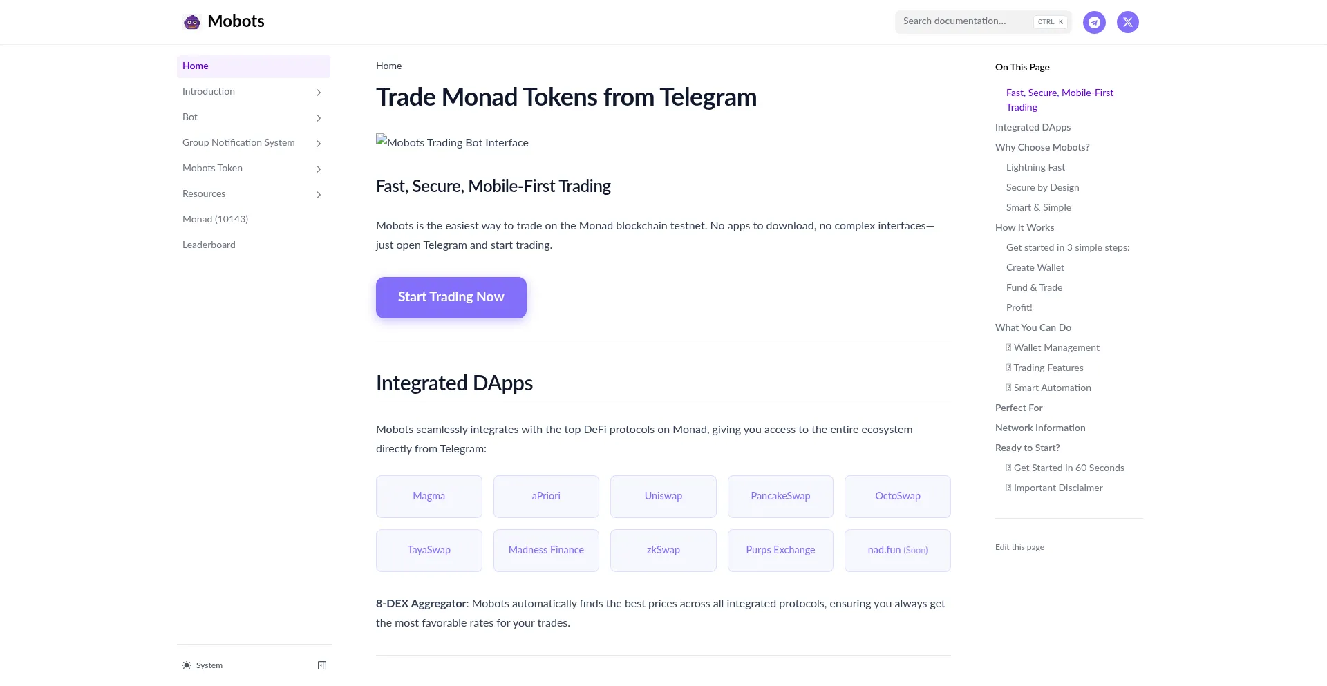 Trade Monad tokens directly from Telegram. Fast, secure, mobile-first trading bot for the Monad blockchain testnet.