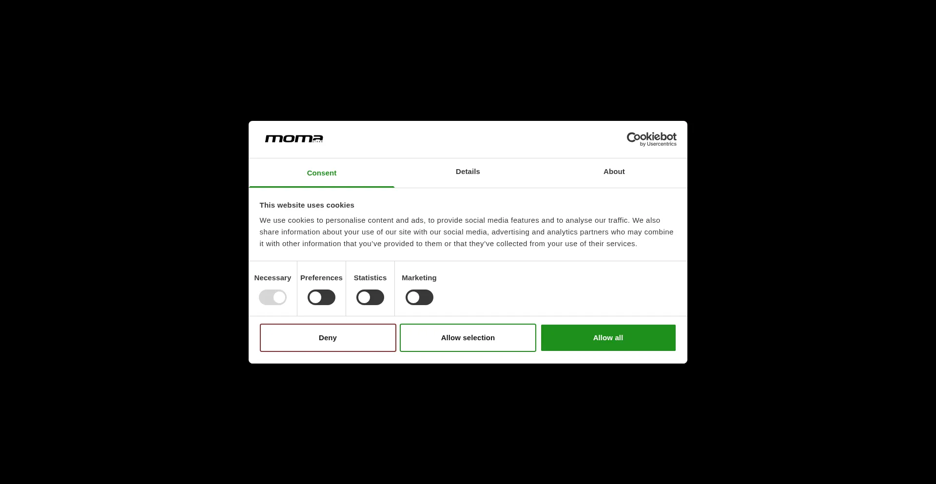 O site implementa mecanismos de consentimento de cookies em conformidade com regulamentações de privacidade como GDPR ou CCPA. Isso demonstra que momabikes.com adere a padrões de proteção de dados e fornece aos usuários controle sobre práticas de coleta de dados pessoais.