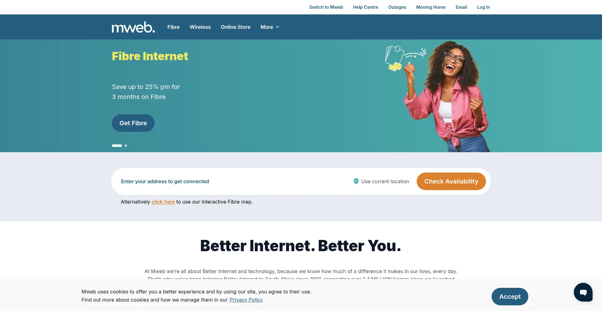 From fibre to LTE, broadband, hosting & more, Mweb is the number one choice for affordable internet packages. Sign up now and come home to better internet.