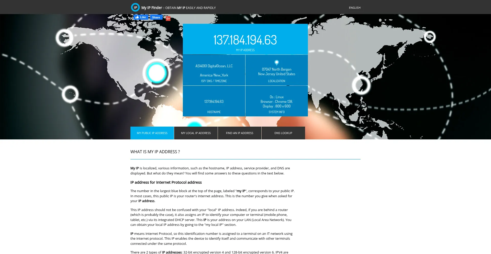 My IP is localized, various information, such as the hostname, IP address, service provider, and DNS are displayed.