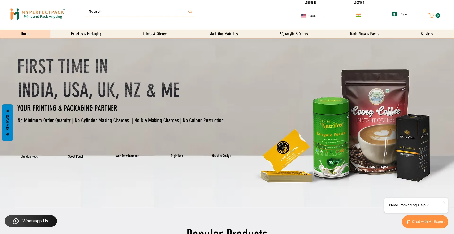 Myperfectpack brings digital printing and packaging solution with no minimum order quantity ( No MOQ) . Buy Tin Jar, Glass Jar, Standup Pouch, Label , Mug and 3D Printing with ...