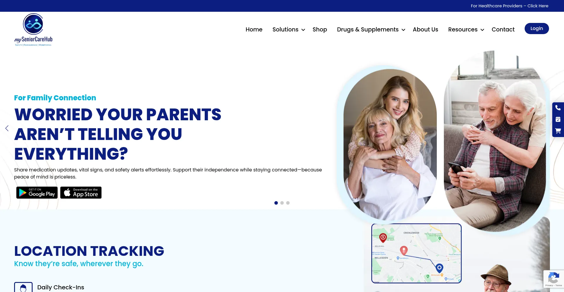 Comprehensive senior care app with health monitoring, medication management, safety, and enhancing elder lives and family peace of mind. Available on Android & iOS