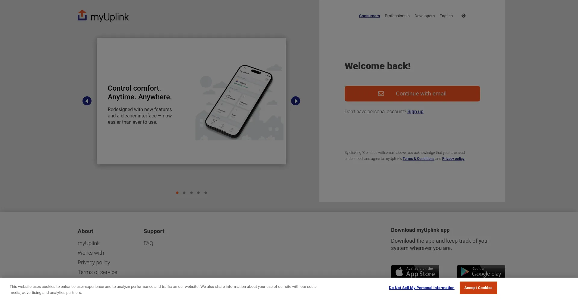 O site implementa mecanismos de consentimento de cookies em conformidade com regulamentações de privacidade como GDPR ou CCPA. Isso demonstra que myuplink.com adere a padrões de proteção de dados e fornece aos usuários controle sobre práticas de coleta de dados pessoais.