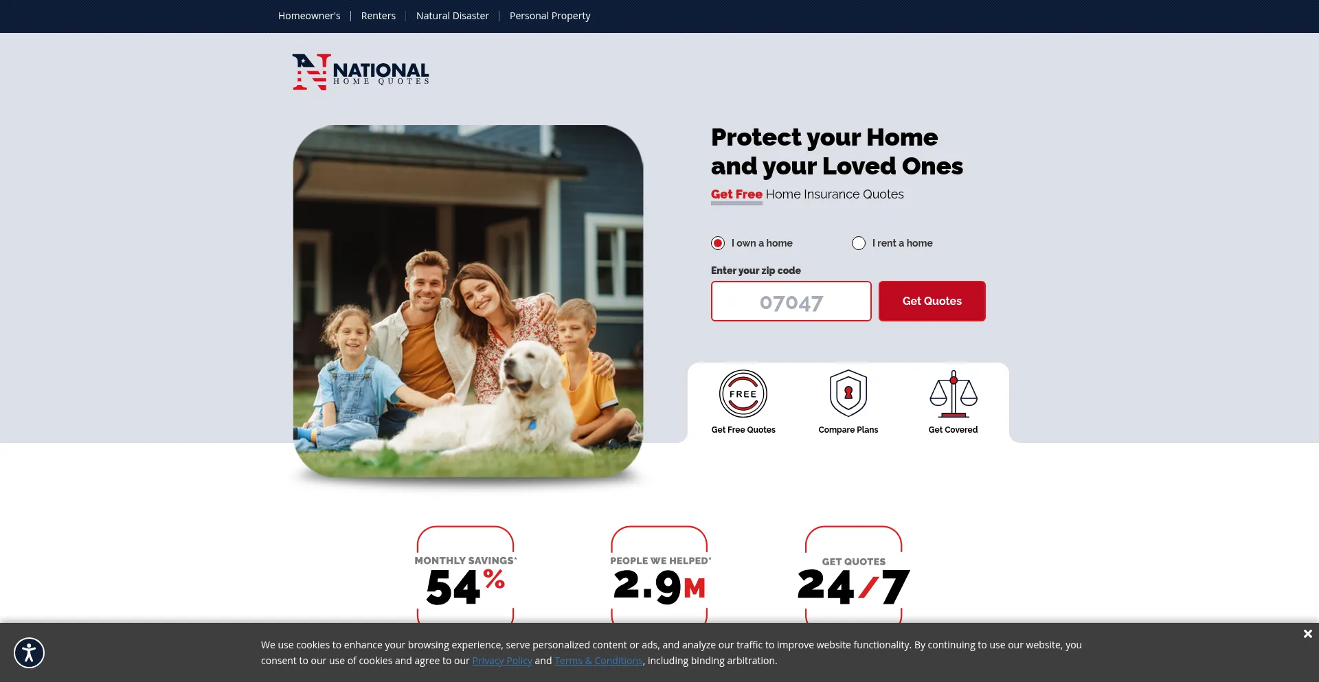 O site implementa mecanismos de consentimento de cookies em conformidade com regulamentações de privacidade como GDPR ou CCPA. Isso demonstra que nationalhomequotes.com adere a padrões de proteção de dados e fornece aos usuários controle sobre práticas de coleta de dados pessoais.