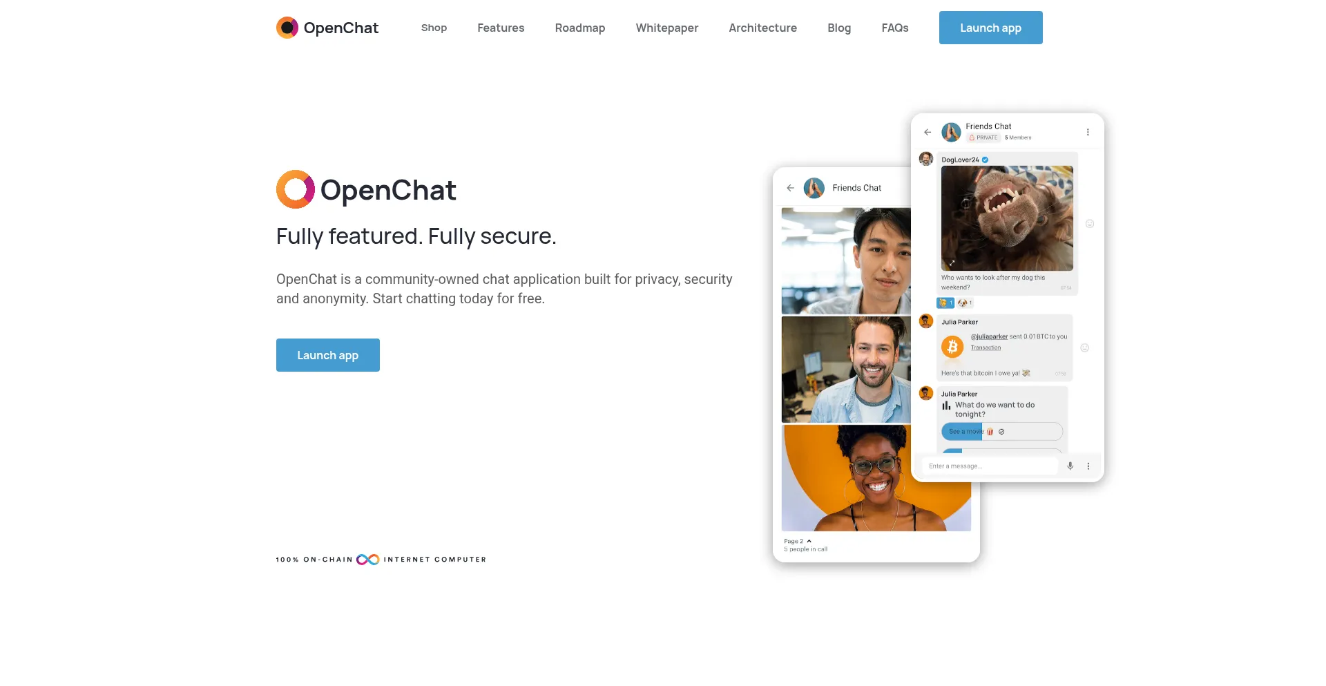 OpenChat is a fully featured chat application running end-to-end on the Internet Computer blockchain.