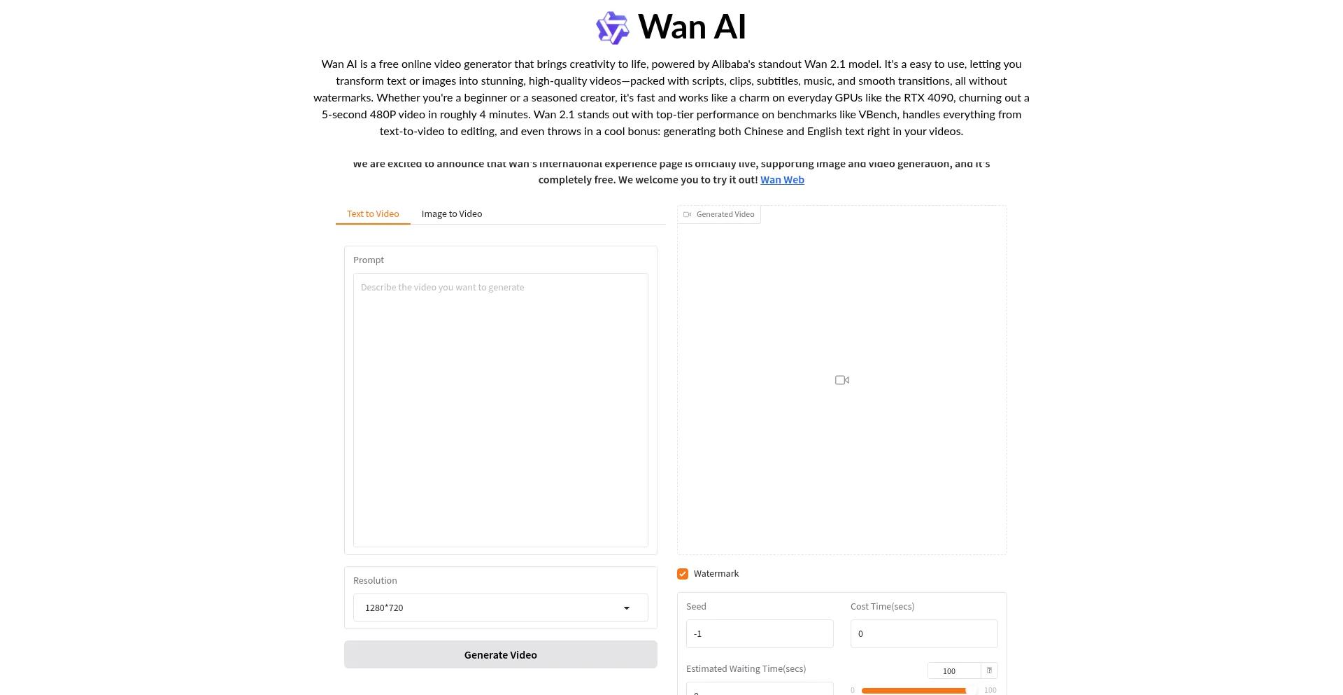 Wan AI is a free online AI video generator with Wan 2.1 Model that turns text or image into videos with scripts, clips, subtitles, music, and transitions. No watermarks, easy to...
