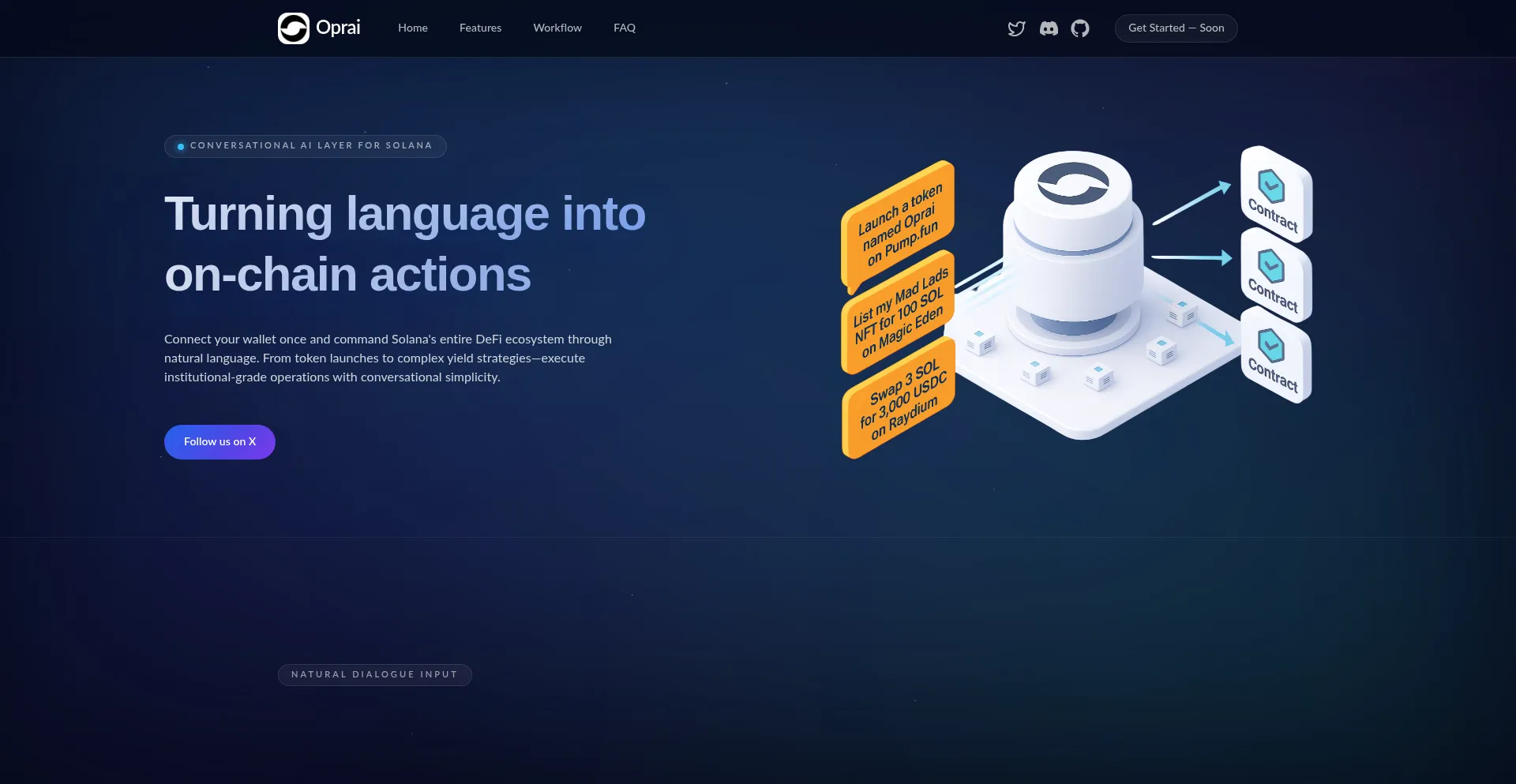 Oprai is a Solana-native AI agent that can execute everything on-chain: NFT trading, token swaps, perp DEX, token launch, and more — through natural language.