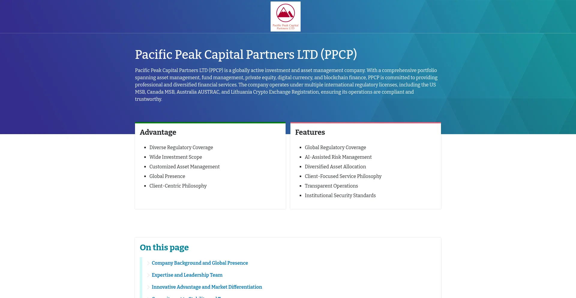 Explore the professional strengths of Pacific Peak Capital Partners LTD (PPCP), a globally licensed investment firm specializing in diversified asset management and digital fina...