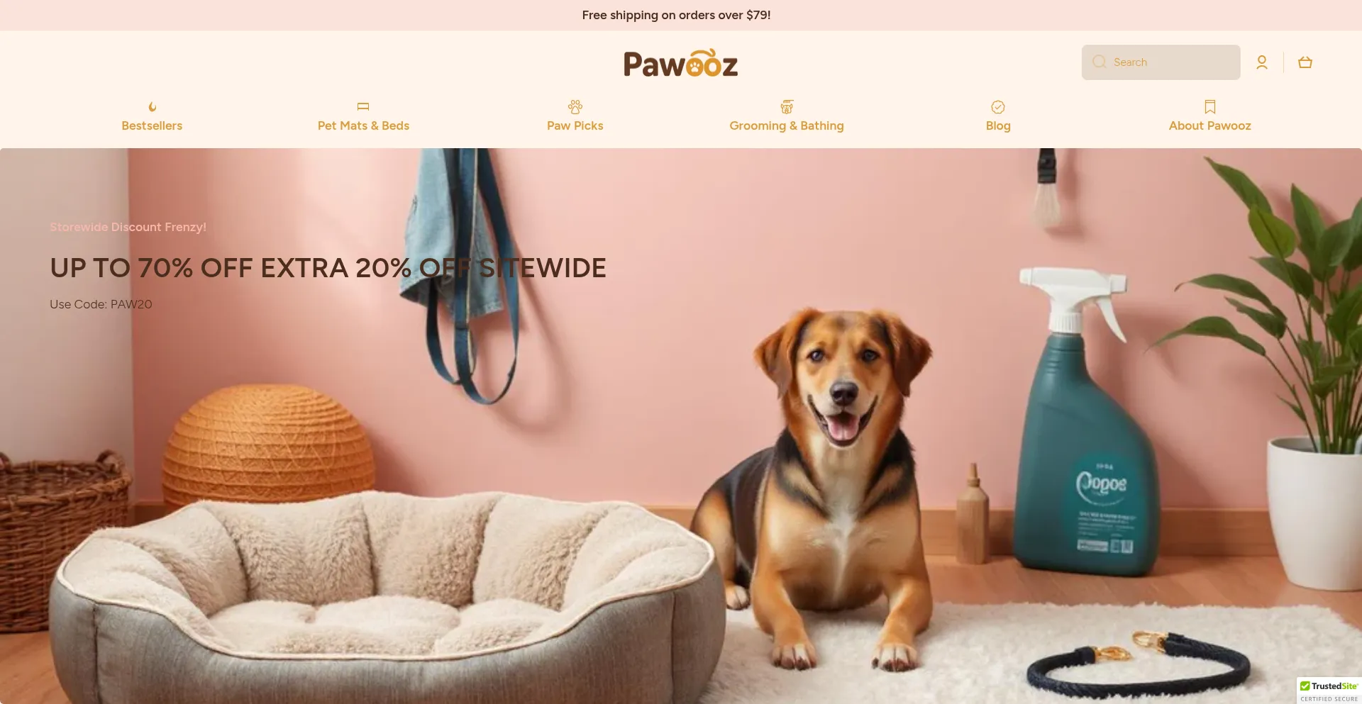 Discover washable beds, cooling mats, toys, leashes & grooming tools at Pawooz. Stylish pet gear with free shipping over $79.