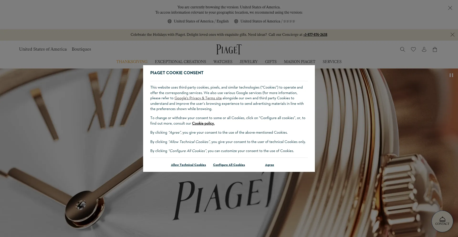 O site implementa mecanismos de consentimento de cookies em conformidade com regulamentações de privacidade como GDPR ou CCPA. Isso demonstra que piaget.com adere a padrões de proteção de dados e fornece aos usuários controle sobre práticas de coleta de dados pessoais.