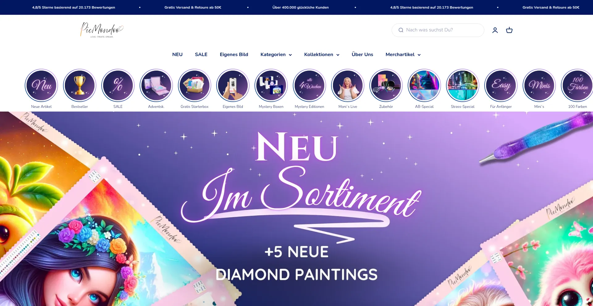 Von handgemachten Diamond Painting Sets über nützliches Zubehör bis hin zu personalisierten DIY-Sets. Kaufe jetzt im offiziellen PICMONDOO Online Shop unsere Produkte.