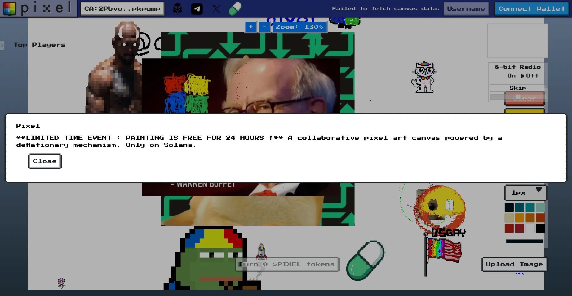 A collaborative pixel art canvas powered by a deflationary mechanism. Only on Solana.