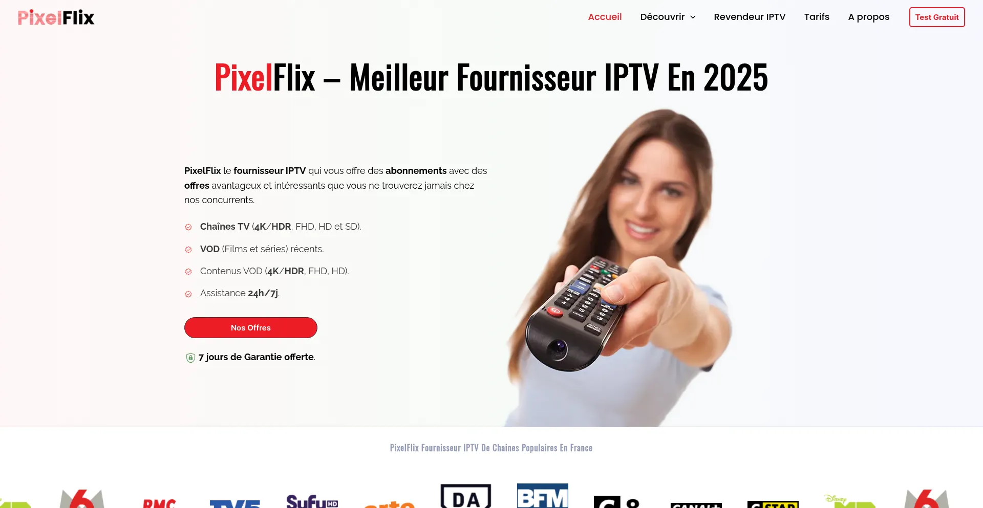 PixelFlix est le fournisseur IPTV qui offre : Qualité, Bon Prix, Teste avant paiement, SAV réactif 24h/24 7j/7, Garantie de remboursement.