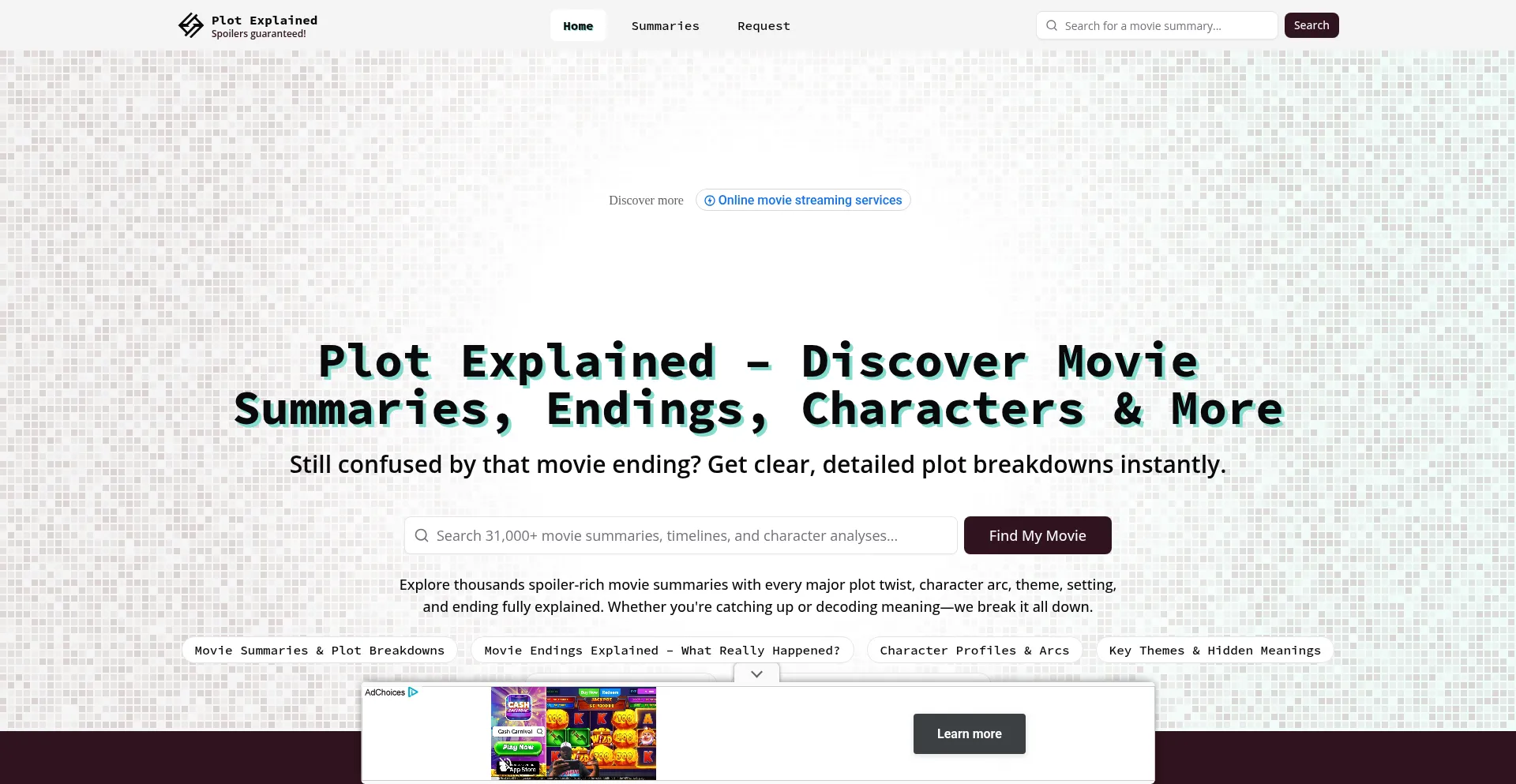 Explore thousands of detailed movie summaries, timelines, character breakdowns, themes, and settings. Dive deep into your favorite films and uncover what they really mean with P...