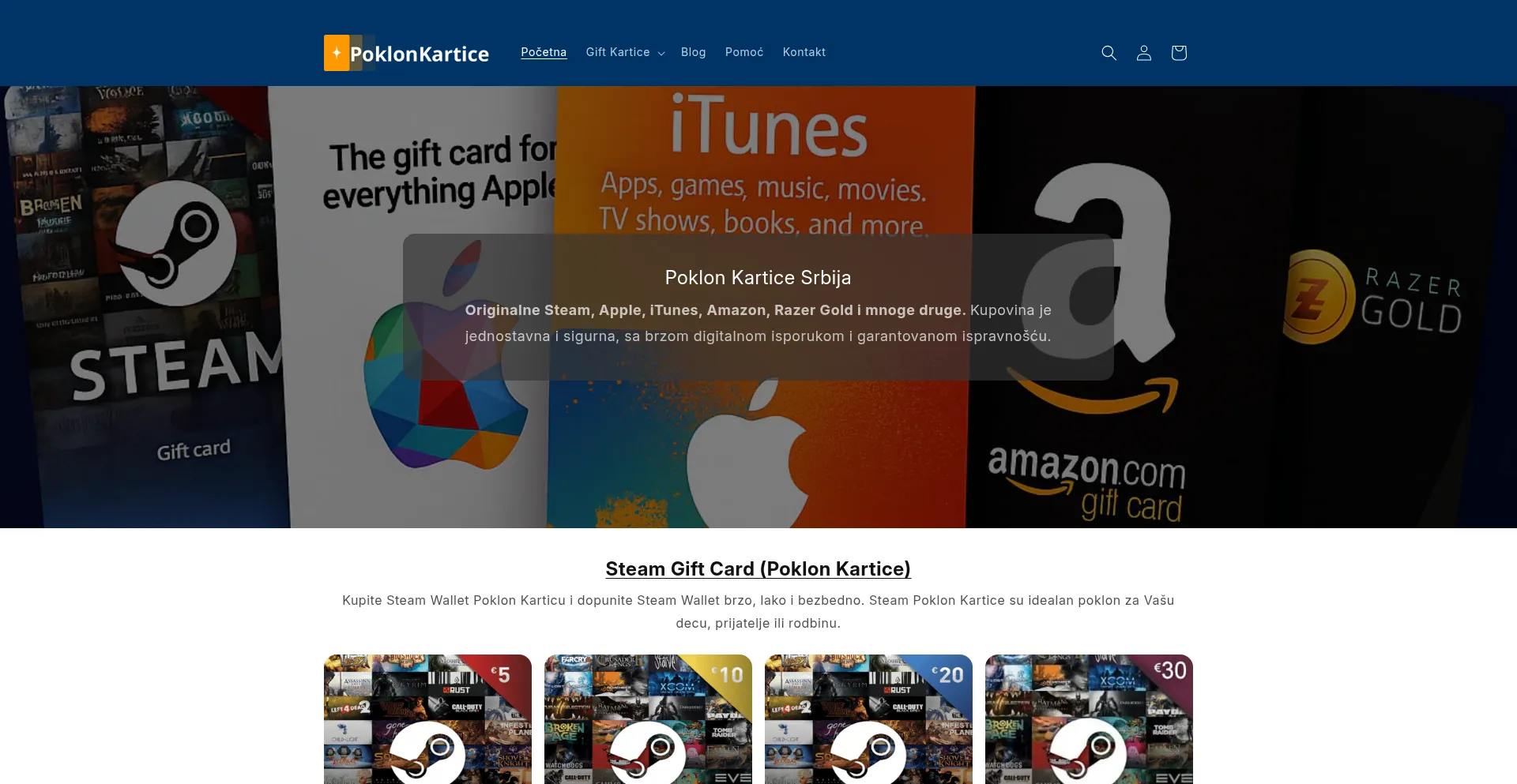 Kupujte poklon kartice u Srbiji brzo i sigurno! Digitalne gift kartice za igre, aplikacije i prodavnice. Brza isporuka i 100% sigurna kupovina svih Steam Wallet, Amazon, Apple i...